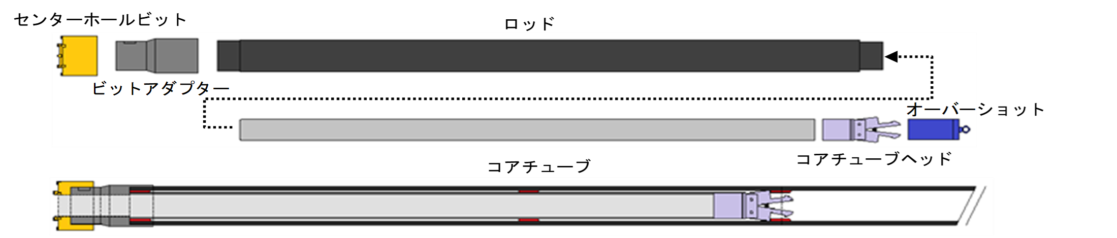 Core-DRISSは、山岳トンネルの汎用掘削機械であるドリルジャンボを用いて切羽前方の地山試料を迅速かつ連続的に回収することができるコアボーリングシステムです。