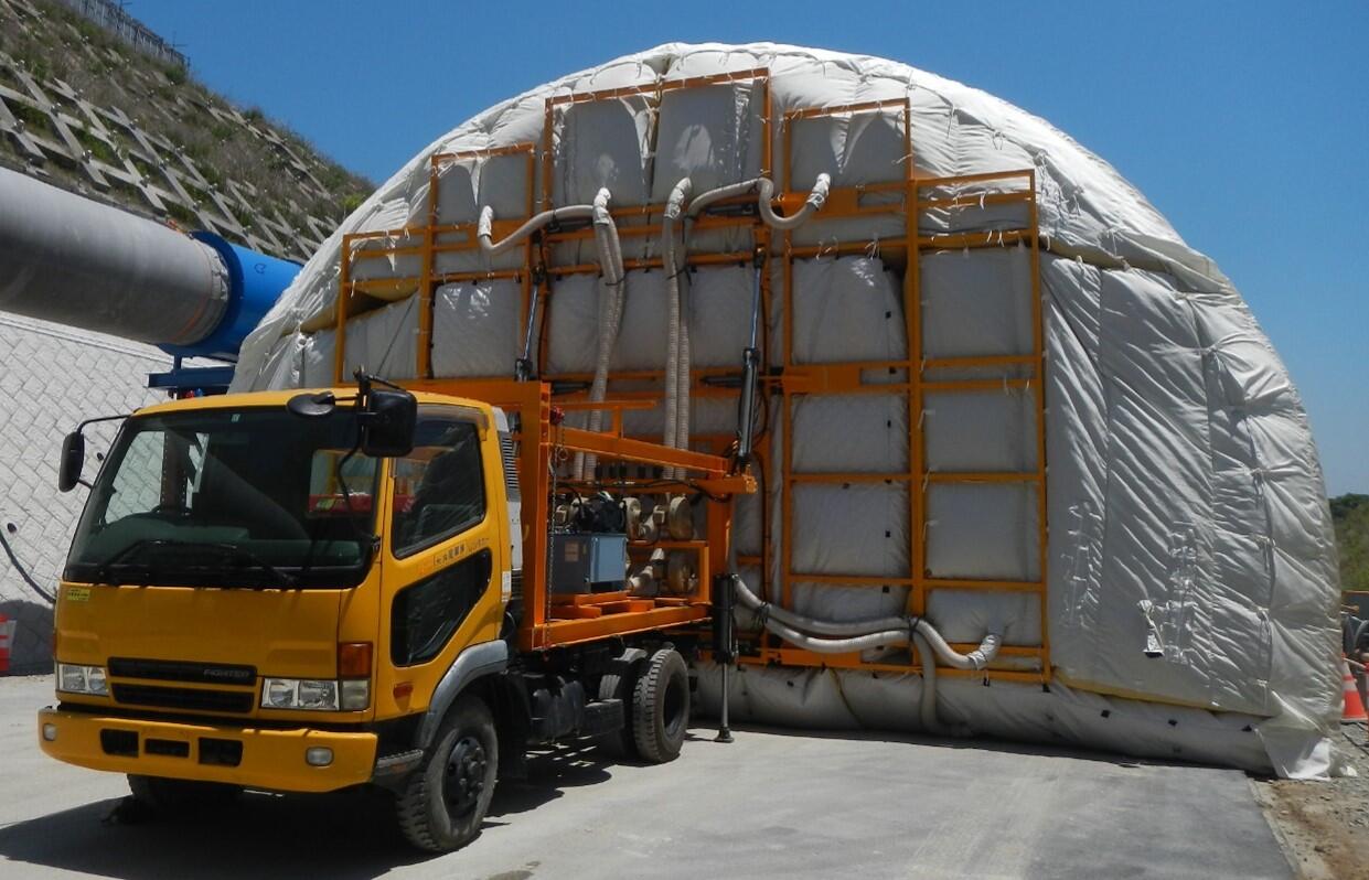 移動式発破防護バルーンは、トンネル坑内における発破時の飛石を切羽付近に封じ込めるための装置です。連続ベルトコンベヤシステムの先頭設備(クラッシャー)を防護し、切羽からクラッシャーまでの一次ずりの運搬距離を従来よりも短くすることで、掘進速度を向上させます。