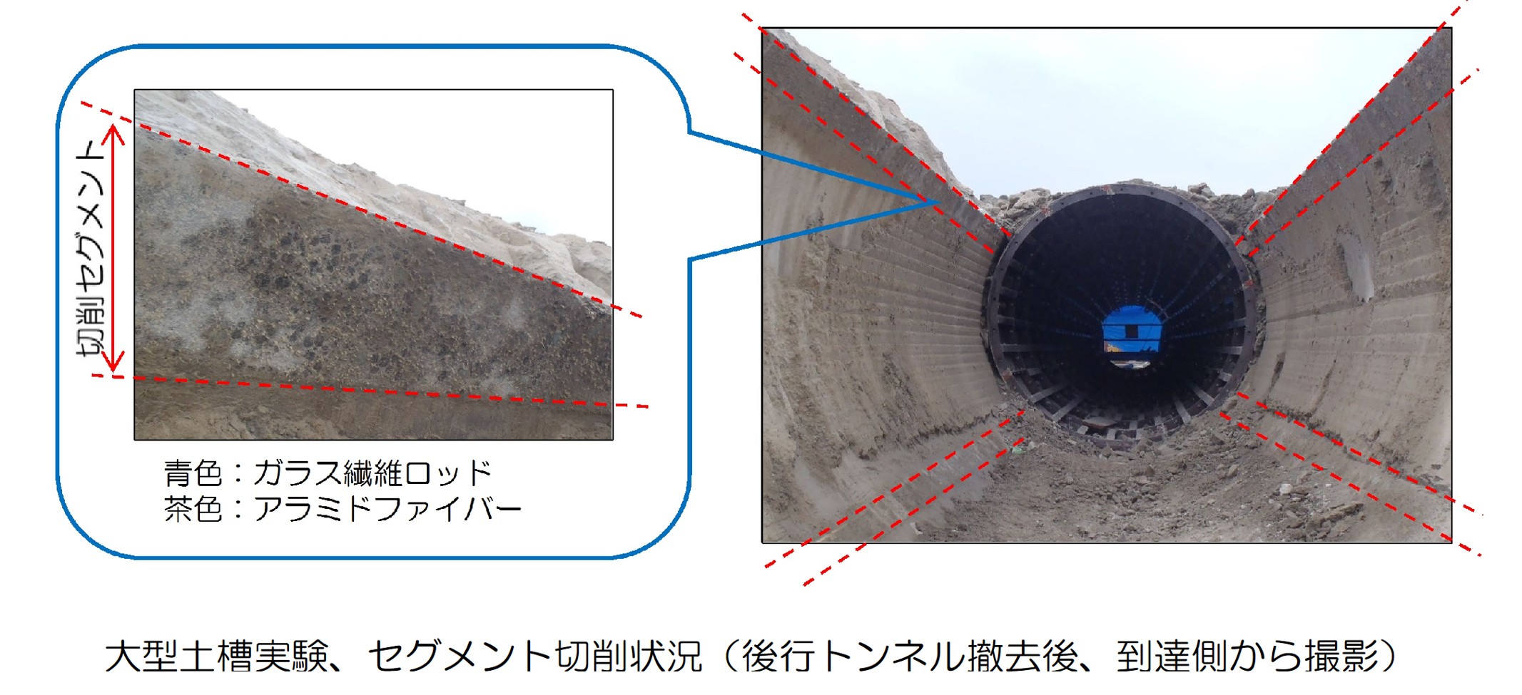GFRCセグメントは、鉄筋の代わりにガラス繊維ロッド、骨材には軽量骨材、ひび割れ防止にアラミドファイバーを使用するもので、構造実験、切削性能実験、大型土槽内の実施工模擬実験により、構造面(曲げ耐力、靭性)、切削性、施工性に優れていることを確認しています。
