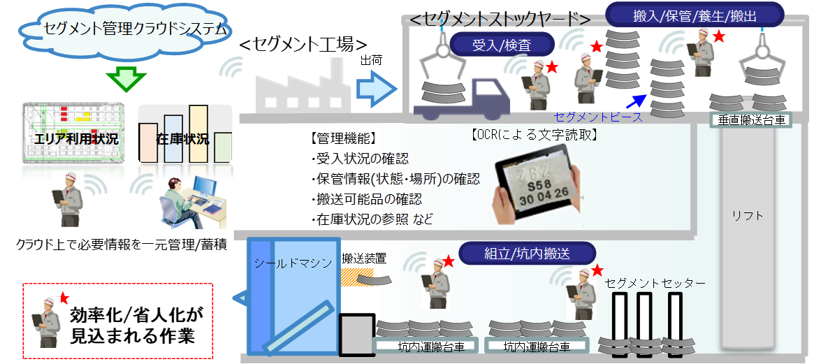 「セグメント管理システム」は、 新たなマーキングに頼らず、各セグメントピースに印字されている製造番号を文字認識読取技術(OCR)でデジタル化し、各セグメントピースの仮置き場所や組み立て順序・位置などの情報を紐付けし、受入れから組み立てまでの一連の施工の各場面において、クラウド上の専用アプリで情報を閲覧し管理していくシステムです。作業プロセスに従って作業状況が記録されるので、リアルタイムに作業進捗、在庫状況の把握と共有が可能です。作業に必要な情報を信頼性高く提供することで省人化と効率化を図ります。
