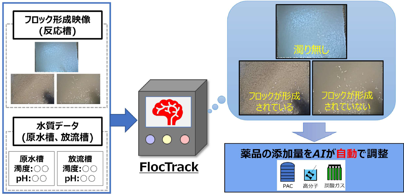 本システムは、濁⽔処理設備内で計測しているpHや濁度と、⼟粒⼦の凝集状況(フロックの形成状況)の映像をもとに、⽔質に合わせて各種処理剤の添加量をAIで最適に調整・添加します。