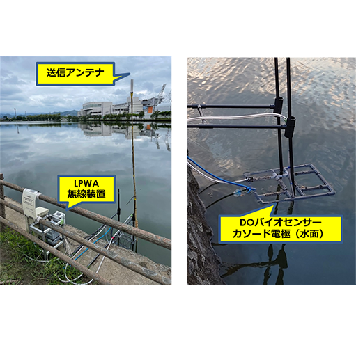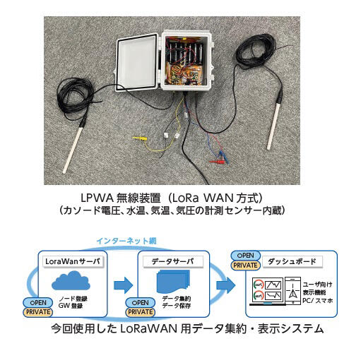 本技術は和歌山大学が防災/減災への活用のために開発し、LPWA※1と河川設置⽔位計を連携させた「住⺠設置型簡易⽔位計(あひるさんボード)」のIoT遠隔監視技術と、群⾺大学と共同で開発した⾃⽴電源型のMFC式DOバイオセンサー※2の技術を一体化させたものであり(LPWA-DOバイオセンサー)、閉鎖性⽔域における底層溶存酸素(DO)を連続計測可能な省エネルギー遠隔監視環境モニタリング技術です。